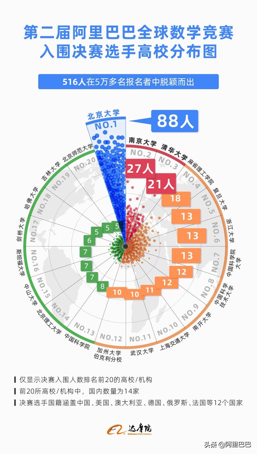 第二届阿里巴巴全球数学竞赛于3月5日面向全球数学爱好者启动报名,共吸引了来自北京大学、清华大学、哈佛大学、剑桥大学等全球71个国家和地区的知名高校和机构5万多名选手参与。比赛于3月14日正式开赛,经过两轮积分制比赛的激烈角逐,只有1%的选手留到了最后,全球共516名选手进入决赛,决赛选手涵盖中国、美国、澳大利亚、德国、俄罗斯、法国等12个国家。决赛将于4月18日举行。