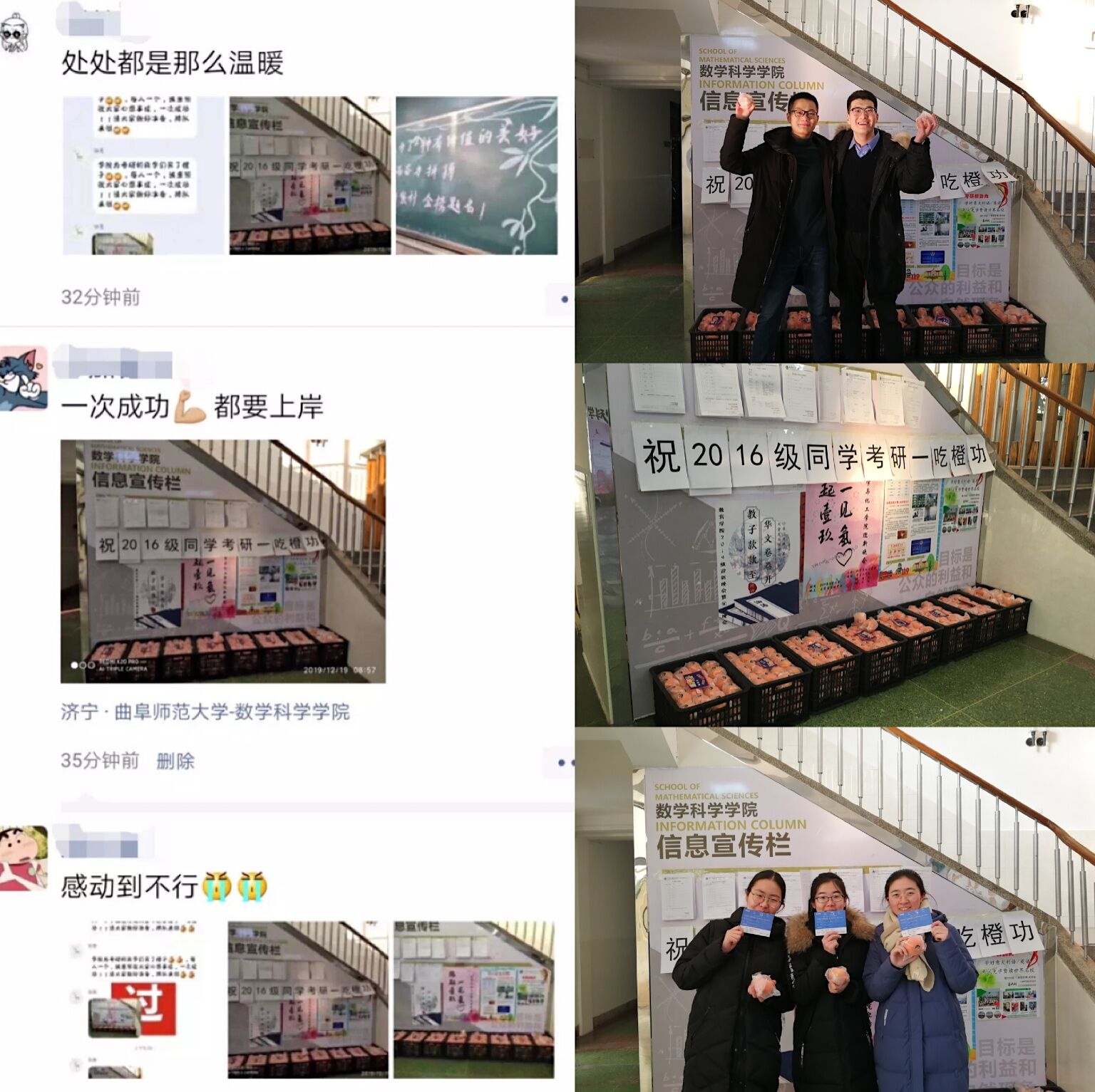 为帮助同学们缓解考前的紧张心情,鼓励同学们积极自信参加考试,学院党委副书记曲凤东一大早前往水果批发市场为同学们采购橙子。橙子到达学院后,同学们欢呼雀跃,纷纷发QQ、朋友圈、微博等赞叹“太暖心”“爱我数科院”“一定成功”!20日上午,数学科学学院辅导员老师前往考研学生乘车集中点,为他们打气加油。
