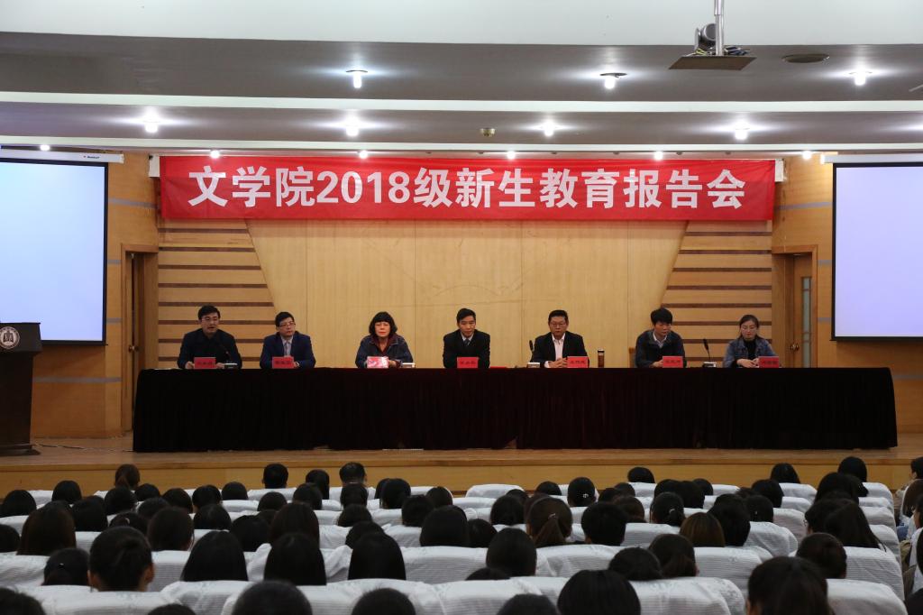 10月17日下午,文学院举行2018级新生教育报告会。党委书记苏占兵、院长夏静、党委副书记王作茂、院长助理霍俊国出席报告会。