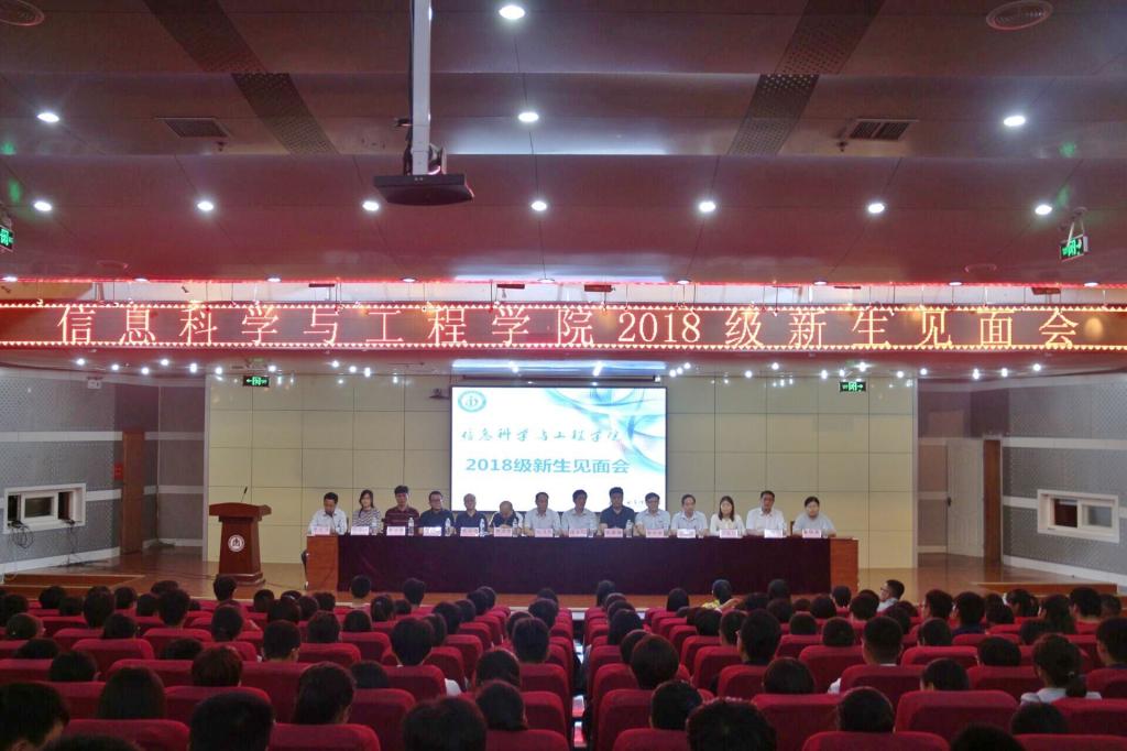 9月29日,信息科学与工程学院2018级新生见面会在图书馆报告厅举行。学生处处长杨永明、信息科学与工程学院党委书记张书东、学生处副处长姚圆鑫、学院党委副书记肖龙航、副院长李光顺、院长助理赵景秀、网络计算与安全技术研究所副所长李凤银、学院实验中心主任王斯锋、数据科学与大数据技术系主任祝永志、计算机科学与技术系主任雷玉霞、网络工程系主任刘效武、本科生党支部书记于运清、辅导员鲁瑞丽、青岛英谷科技有限公司驻校代表徐妍以及辅导员助理应邀出席。见面会由学院团委书记毕文波主持,2018级全体新生参加。