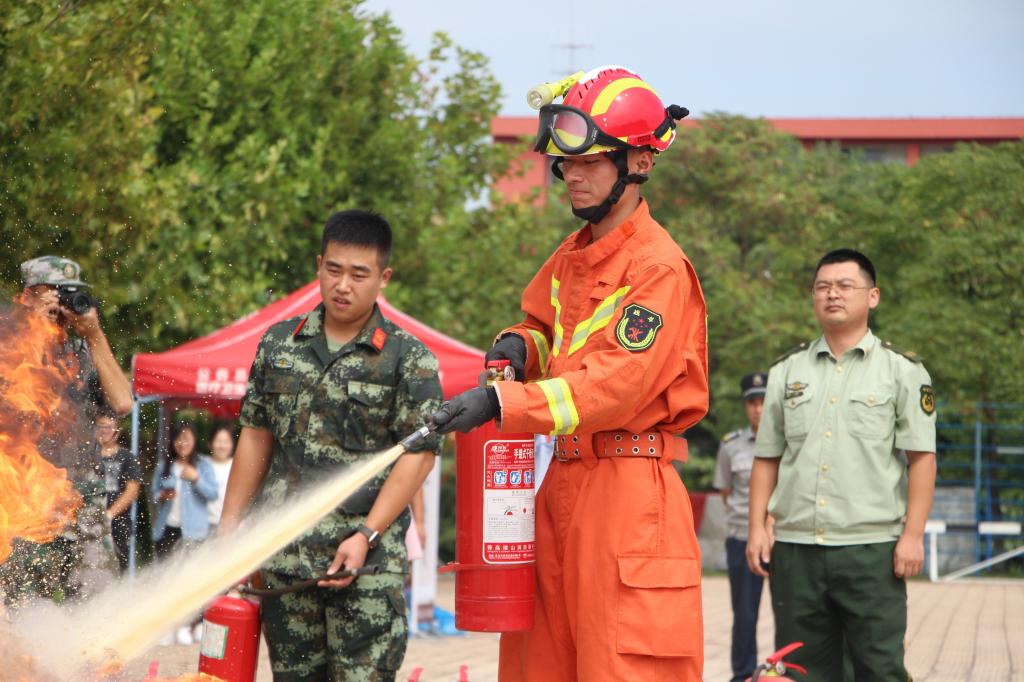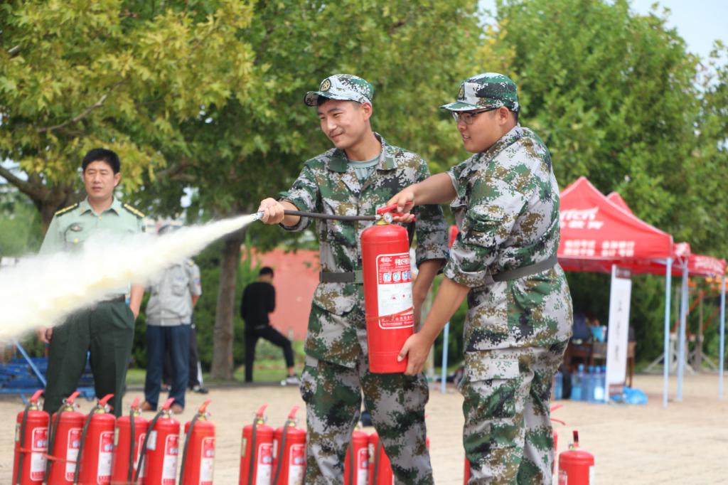 消防演练活动中,陈长红紧密结合学校实际和消防案例,用通俗易懂的语言,生动的实例,向全体军训新生讲解日常的基本消防安全知识、校园之内有哪些防火隐患、宿舍存在哪些消防隐患、发生火灾后应如何逃生等一系列消防知识。日照市消防支队官兵为同学们介绍了干粉灭火器的使用方法和灭火要点,并让来自各个军训连队的同学们上前进行实战演练。