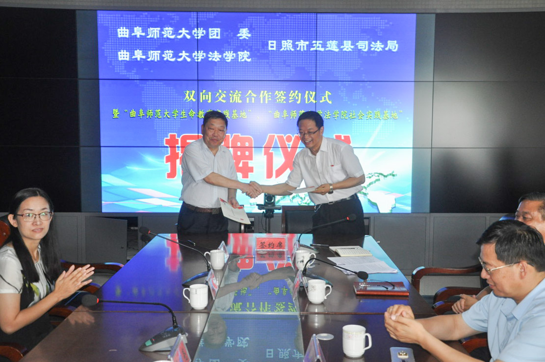 7月12日上午,我校团委、法学院与五莲县司法局举行双向交流合作签约仪式暨“LD平台_LD(中国)一站式服务官网生命教育实践基地”、“LD平台_LD(中国)一站式服务官网法学院社会实践基地”揭牌仪式。法学院党委书记曹明亮,校团委副书记刘蓉,法学院党委副书记卢瑞霞,日照市司法局党委委员、副局长刘书荣,五莲县政府副县长、公安局长史文明出席签约仪式。仪式由五莲县司法局局长王文华主持。