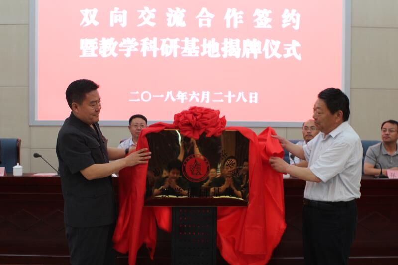 会上,潘秀峰作了致辞,曹明亮发表了相关讲话。张益刚与潘秀峰签订了双向交流合作意向书,曹明亮与潘秀峰共同为教学科研基地揭牌。