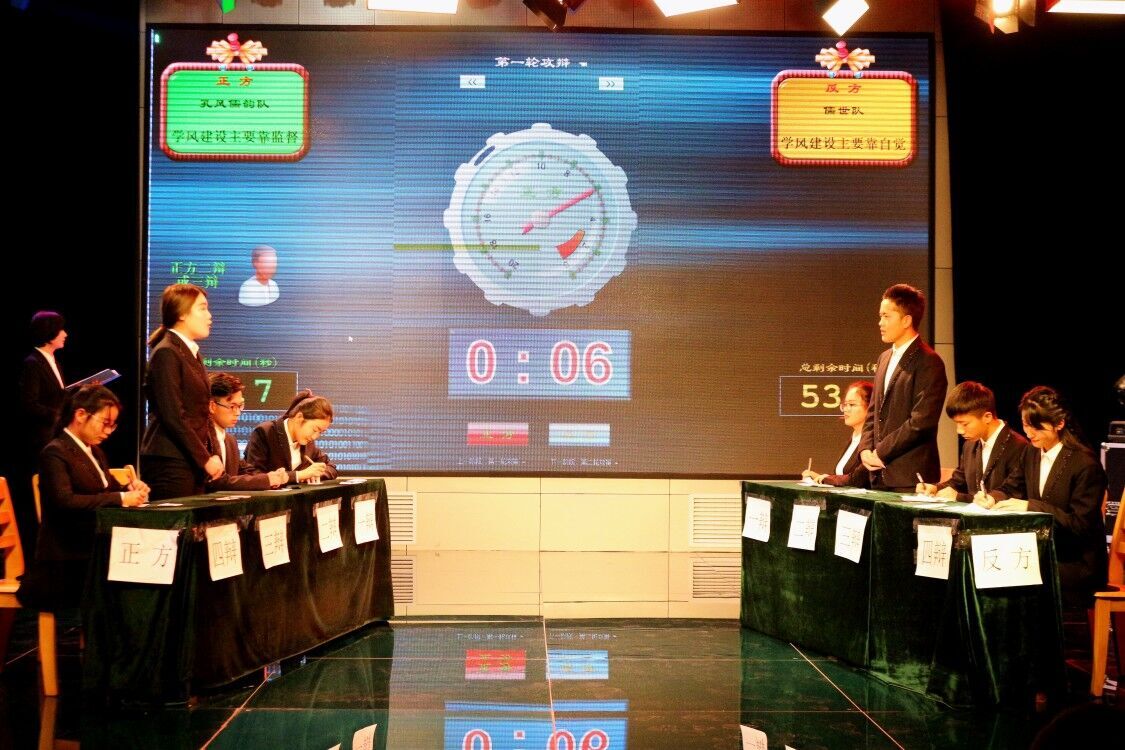经过初赛、复赛的层层选拔和激烈争夺,儒世队孔风儒韵队求索队三支队伍凭借出众的实力和优异的表现过关斩将,脱颖而出,来到决赛的舞台。决赛选定监督和自觉哪个在学风建设中更为重要当前的国际形势下,中国外交应该韬光养晦还是强势出击国家发展战略是应该选择城镇化优先发展还是振兴农村优先三个主题依次展开辩论,三支队伍根据抽签顺序两两对决。双方对手你来我往,唇枪舌剑,互不相让,各队选手旁征博引、慷慨激昂。辩论时选手们妙语连珠,他们出色的口才、敏捷的思维令场下观众为之折服,掌声不断。最后,儒世队摘得桂冠,孔风儒韵队求索队分列亚军和季军;杨思远、孙硕、毕水思三位同学获最佳辩手”称号