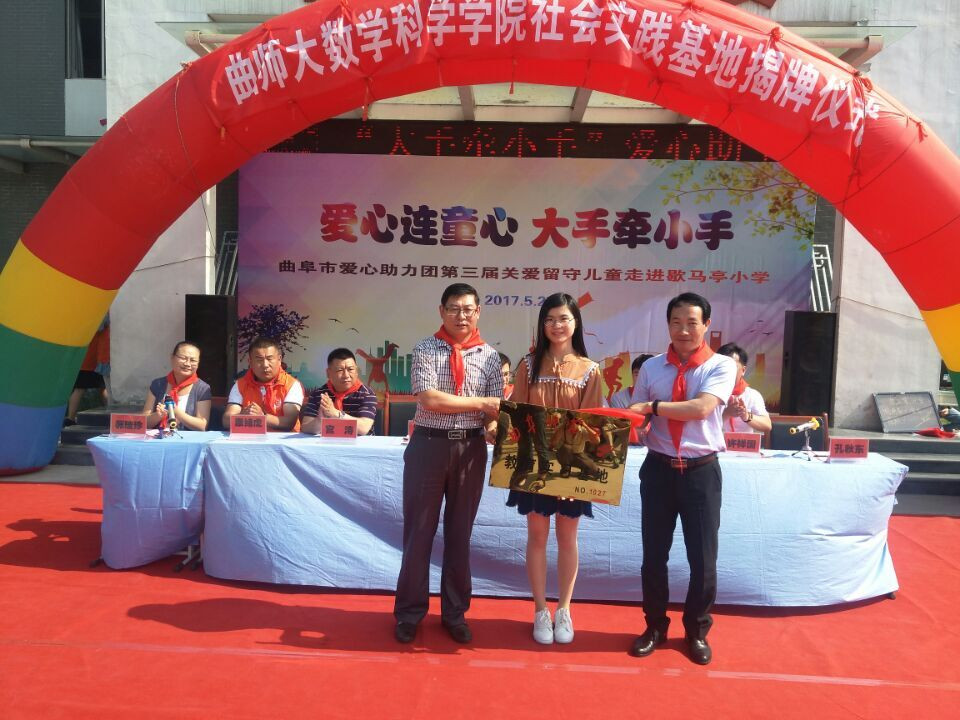 5月27日,数学科学学院教育实习基地、社会实践基地揭牌仪式暨携手爱心助力团庆“六一”爱心捐赠活动在歇马亭小学举行。校团委、数学与统计学院负责人及部分师生代表,曲阜市团市委、民政局、石门山镇党委等部分机关单位负责人、爱心助力团爱心人士代表、曲阜市妇幼保健院部分医生以及歇马亭小学全体师生参加了活动。