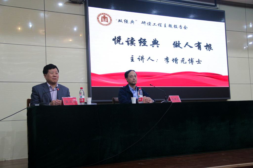 表彰大会后,“悦读经典,做人有根”的双经典研读工程主题报告会开始。学部党委书记张立兴主持,政治学与行政学系主任李增元博士担任主讲。