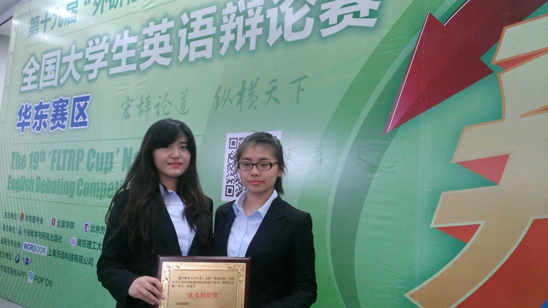 自去年11月开始,华东赛区经过5个月的校园选拔赛,决出了105支地区决赛的参赛队伍,分别来自安徽,上海,江苏,浙江,山东。比赛采用英国议会辩论赛制,辩题涉及政治、伦理、教育、文化等社会热点问题。在为期一天半紧锣密鼓的五轮循环赛中,翻译学院袁鹤文、毕桐桐两位选手在张巍副教授指导下表现出色,充分展现出我校大学生睿智和善辩的风采,最终获得华东赛区三等奖的好成绩。同时,我校因在校园选拔赛事组织方面表现出色,而获得最佳组织奖称号。