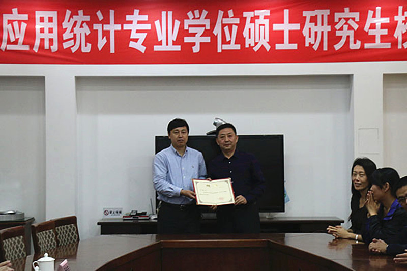 副校长张洪海在致辞中介绍了我校统计学科的学位点建设及研究生培养情况,并对本次受聘的四位教授表示欢迎与感谢。随后,张校长向受聘硕士生导师颁发了聘书。崔凤成和尹强作为外聘导师代表发言,他们在肯定我校统计学院研究生培养质量的同时均表示要尽己所能为应用统计专业学位硕士研究生培养贡献力量。
