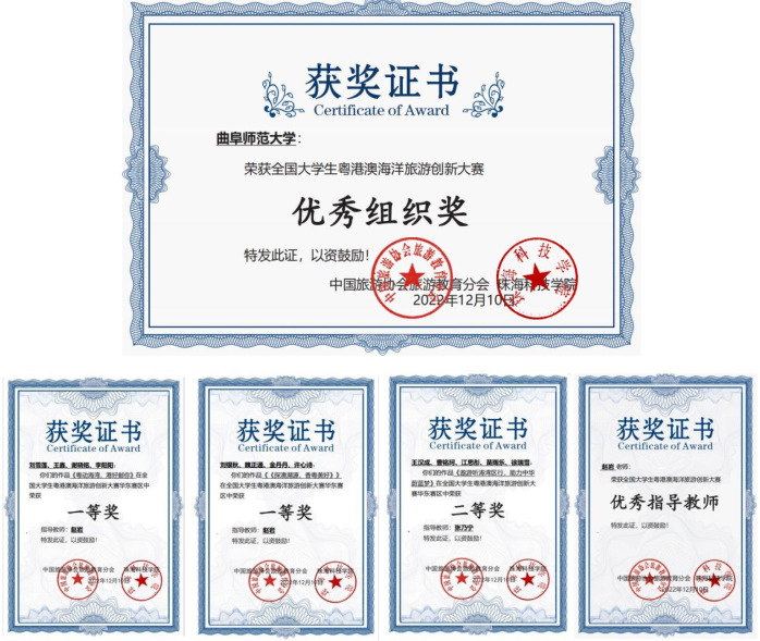 曲阜师大地理与旅游学院讯 近日,由中国旅游协会旅游教育分会主办的“全国大学生粤港澳海洋旅游创新大赛”落下帷幕。曲阜师大地理与旅游学院参赛学子荣获华东赛区一等奖2项、二等奖1项。曲阜师大获得大赛优秀组织奖,赵岩老师获优秀指导教师奖。