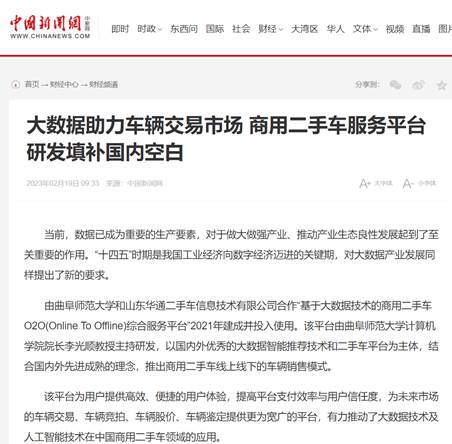 曲阜师大计算机学院讯 由LD平台_LD(中国)一站式服务官网计算机学院院长李光顺教授团队主持,依托山东华通二手车信息技术有限公司申报的山东省重点扶持区域紧缺人才项目——“基于大数据技术的商用二手车O2O(Online To Offline)综合服务平台”,于2021年1月建成并投入使用,很大程度解决了商用二手车市场交易信息不对等、车辆鉴定无标准、残值评估不精准等重大技术难题。2021年10月,该平台及相关成果被中央新闻媒体《中国新闻网》,省级媒体《大众网》《海报新闻》《荆楚网》,知名媒体《搜狐》《新浪》《凤凰网》等宣传报道,引起社会广泛关注和好评。