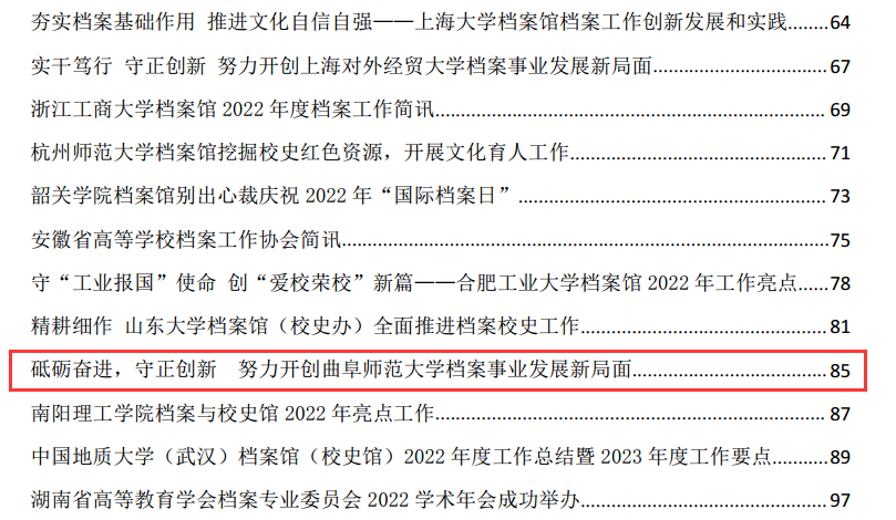 在简报上,曲阜师大档案馆全方位、多角度展现了2022年度完成的重点工作和亮点特色,为提升学校的影响力和美誉度作出了积极贡献。近年来,档案馆深入学习贯彻习近平总书记关于档案工作的重要指示批示精神,对标学校“十四五”事业发展规划,聚焦学校第九次党代会提出的目标任务,切实履行“为党管档、为国守史、为民服务”的光荣职责,档案信息化建设稳步推进,档案资源建设更加充实,档案利用服务水平全面提升,人才队伍建设不断加强,档案文化育人功能充分发挥,为学校深入推进内涵发展和建设世界知名的高水平孔子家乡大学贡献了档案力量。