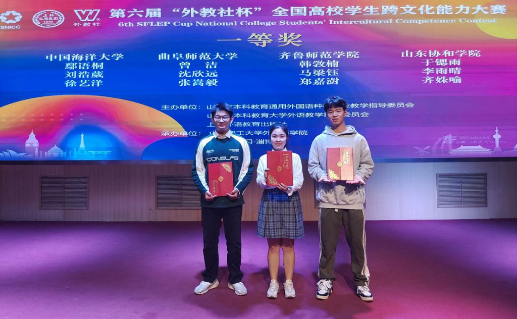 公共外语教学部讯 近日,第六届“外教社杯”全国高校学生跨文化能力大赛山东赛区比赛落下帷幕,由曲阜师大选送的代表队(成员:曾洁、沈欣远、张嵩毅,指导教师:董伟)在复赛与决赛环节中表现出众,荣获山东赛区选拔赛一等奖。