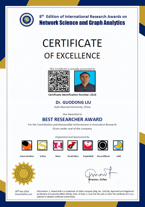 地理与旅游学院讯 近日,曲阜师大地理与旅游学院刘国栋博士在气候变暖对凋落物分解特征和微生物共生网络机制的影响方面取得重要研究进展,经专家提名和评审,荣获2023年国际学术组织ScienceFather颁发的“最佳研究者奖”(8th Edition of International Research Awards on Network Science and Graph Analytics, Best Researcher Award, ScienceFather)。
