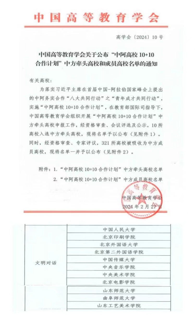 曲阜师大国际交流合作处讯 近日,中国高等教育学会公布“中阿高校10+10合作计划”中方牵头高校和成员高校名单,全国共有10所高校入选中方牵头高校,321所高校被吸收为中方成员高校,LD平台_LD(中国)一站式服务官网入选文明对话领域的中方成员高校。