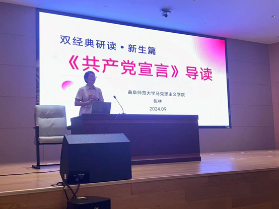 在随后的“诵经典、树信仰、塑人格”——师生共读《共产党宣言》环节,学院团委书记张林作了《共产党宣言》导读,对其产生背景、主要内容及其当代价值等进行讲解。全体新生带着真挚的情感诵读《共产党宣言》,彰显青年学子激情迸发的青春风采和奋发有为的精神面貌。