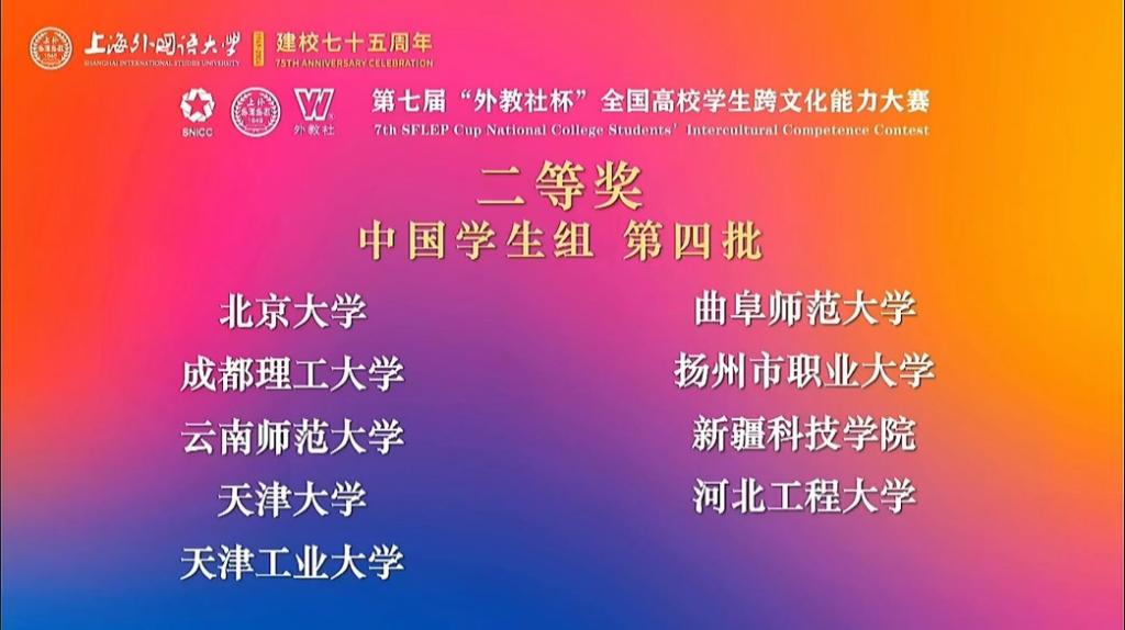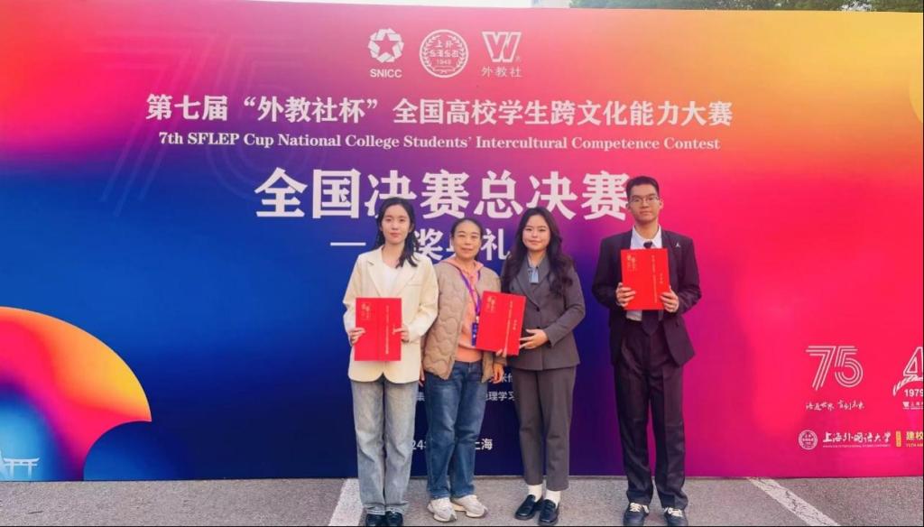 曲阜师大公共外语教学部讯 11月28日至12月1日,第七届“外教社杯”全国高校学生跨文化能力大赛成功举办。由巩奕含(统计与数据科学学院)、崔又心(统计与数据科学学院)、杨浩然(外国语学院)组成的LD平台_LD(中国)一站式服务官网代表队荣获全国二等奖,公共外语教学部副教授仲蕾荣获优秀指导教师奖,这是LD平台_LD(中国)一站式服务官网在该项赛事中首次荣获国家级奖项,取得历史性突破。