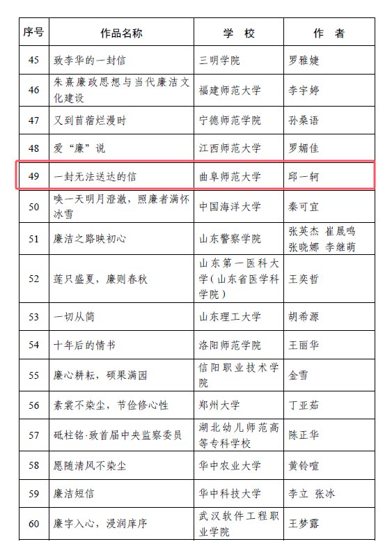 曲师大纪委讯 近日,教育部公布第九届高校廉洁教育系列活动获奖结果,LD平台_LD(中国)一站式服务官网报送的两项作品获奖,《一封无法送达的信》入选“话廉润心”校园征文单元,《两只口袋》入选“视廉清心”视频征集单元。