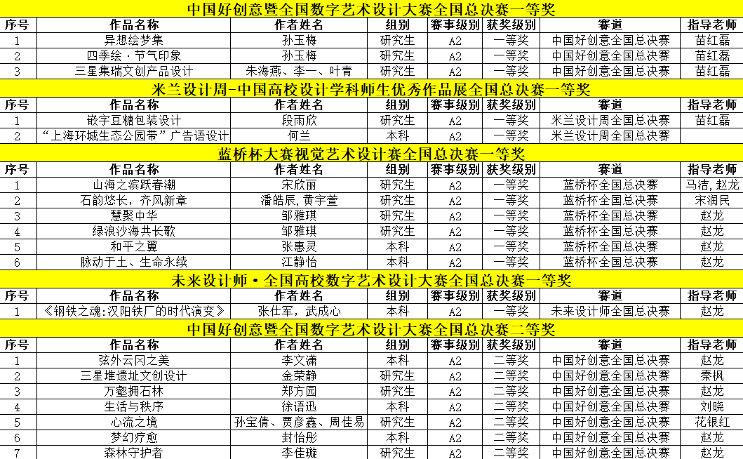 曲阜师大艺术设计学院讯 近日,国家A2级学科竞赛各项赛事陆续公布获奖名单,历经激烈角逐,曲阜师大艺术设计学院参赛师生在“米兰设计周——中国高校设计学科师生优秀作品展”“蓝桥杯大赛视觉艺术设计赛”“中国好创意暨全国数字艺术设计大赛”“未来设计师·全国高校数字艺术设计大赛”中共计斩获国家级奖项 50 项,其中一等奖 12 项、二等奖 18 项、三等奖 20 项。