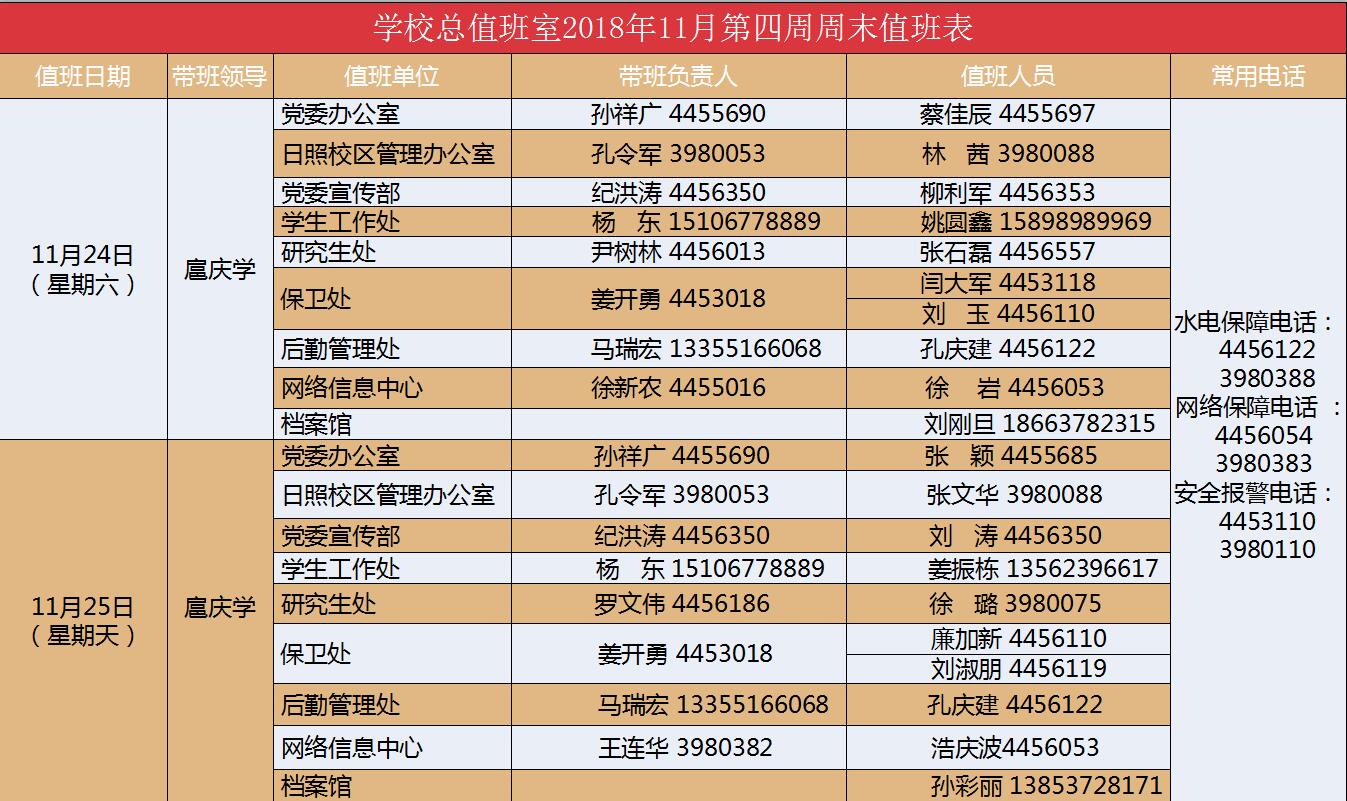 学校总值班室2018年11月第四周周末值班表