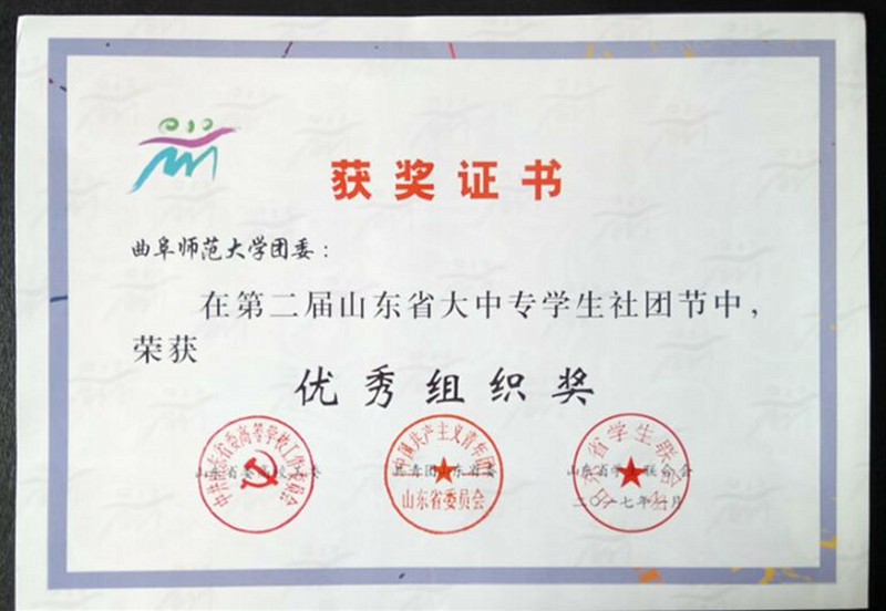 我校荣获第二届山东省大中专学生社团节“优秀组织奖”