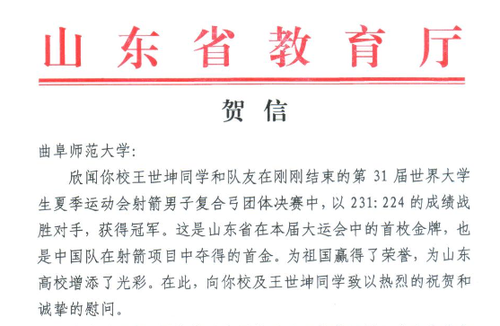 曲园学子夺得大运会山东首金,山东省教育厅向学校发来贺电