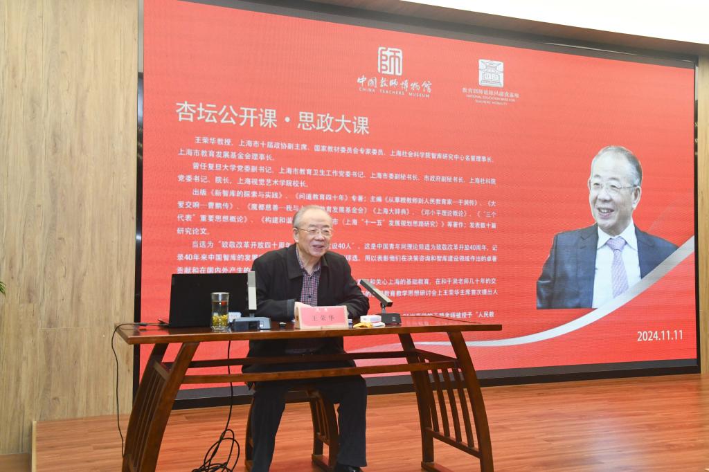 教师博物馆讯 11月11日,上海市十届政协副主席、上海市教育发展基金会理事长王荣华应邀讲授“杏坛公开课”,做了题为《弘扬教育家精神 做于漪式好老师》的专题报告。曲阜师大党委常委、副校长陈刚参加活...